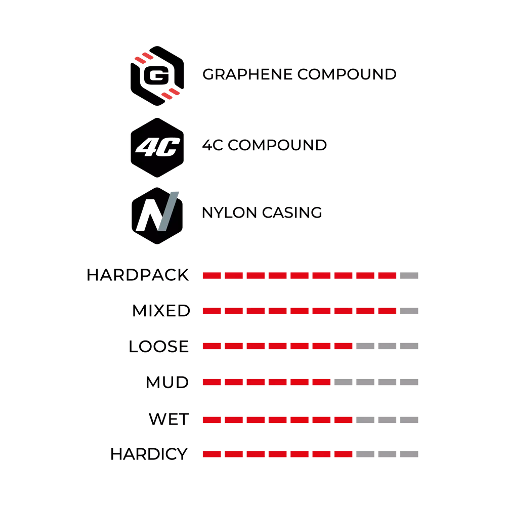 • Linia centrala continua are extensii de decalaj care sunt sipate pentru a multiplica numarul de margini care va propulseaza pe traseu, iar lamelele din spate de pe butoanele de umar sunt inclinate pentru virajele rapide pe suprafete dure si alunecoase. Pentru catarare, viraj sau coborare la deal, nicio anvelopa nu gateste ca Mezcalul. Cauciuc, infuzat cu grafen intr-un program gradat de patru compusi pe banda de rulare si umeri.